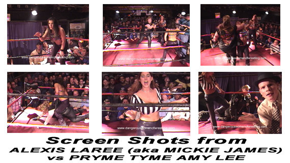 Next out is the lovely CANDIE, dressed in tight blue jeans and half top "got candie" shirt, escorting ALEXIS LAREE aka MICKIE JAMES out in those super tight, shiny black long pants, and a psychedelic fluorescent rainbow pattern halter top. Both girls are DEFINITELY crowd favorites! Alexis and Candie take their shot at busting on the handicapped guy and the way he walks (totally not "pc") --even if he does associate with Amy Lee. Amy Lee voiced her displeasure, and then launched a "hocker" at Candie and Alexis standing in the corner. The crowd is REALLY into this! Alexis and Candie lead the crowd in a chant (which we will leave for the video). The busty one TARA will be the ref for this bout, as she is wearing skin tight, shiny long pants and a sports bra ref shirt.